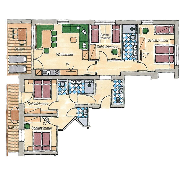 Backrohr, Mikrowelle, Geschirrspüler, Kühlschrank mit Gefrierfach, Tisch- und Bettwäsche, Handtücher, Koch- und Essgeschirr, drei HD Flat-TV, WLAN, Safe.