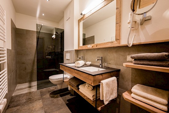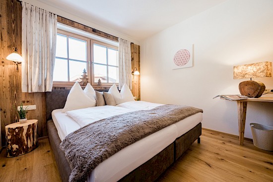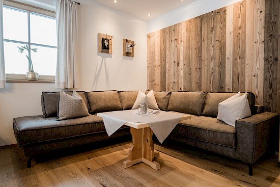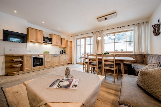 Ob mit der ganzen Familie oder mit Freunden, in der chic gestalteten Wohnung „Sissi“ mit Chalet-Charakter lassen sich entspannte Urlaubstage verbringen. Die offene Raumgestaltung sorgt für Freiraum und die Glasfront zur Terrasse erhellt den gesamten Wohnbereich.