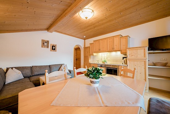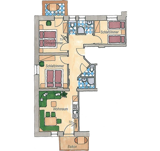 gemütliche Wohnküche (voll ausgestattet), drei Schlafzimmer, zwei Badezimmer mit zwei getrennten WCs, zwei Balkone (süd- und nordseitig).